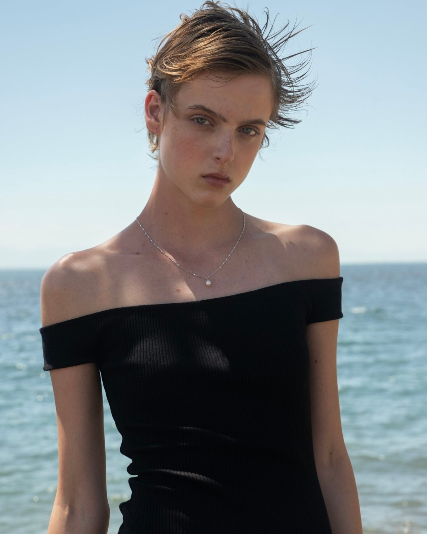 オフショルダーのデザインがシックなタッチを加え、裏地のないミディ丈のカットがエレガントさを演出。