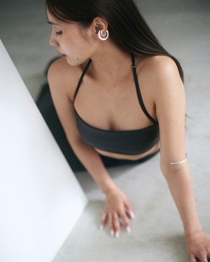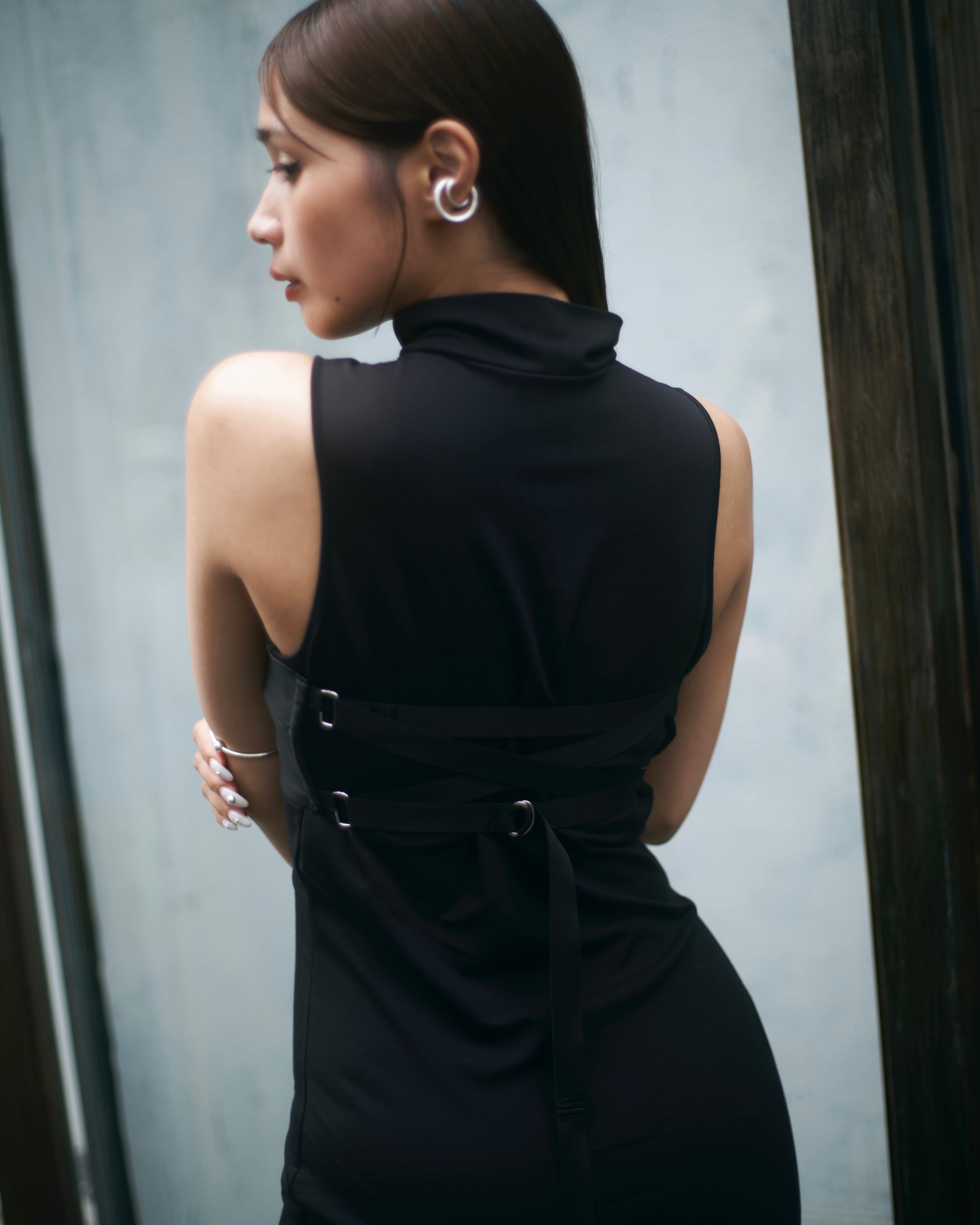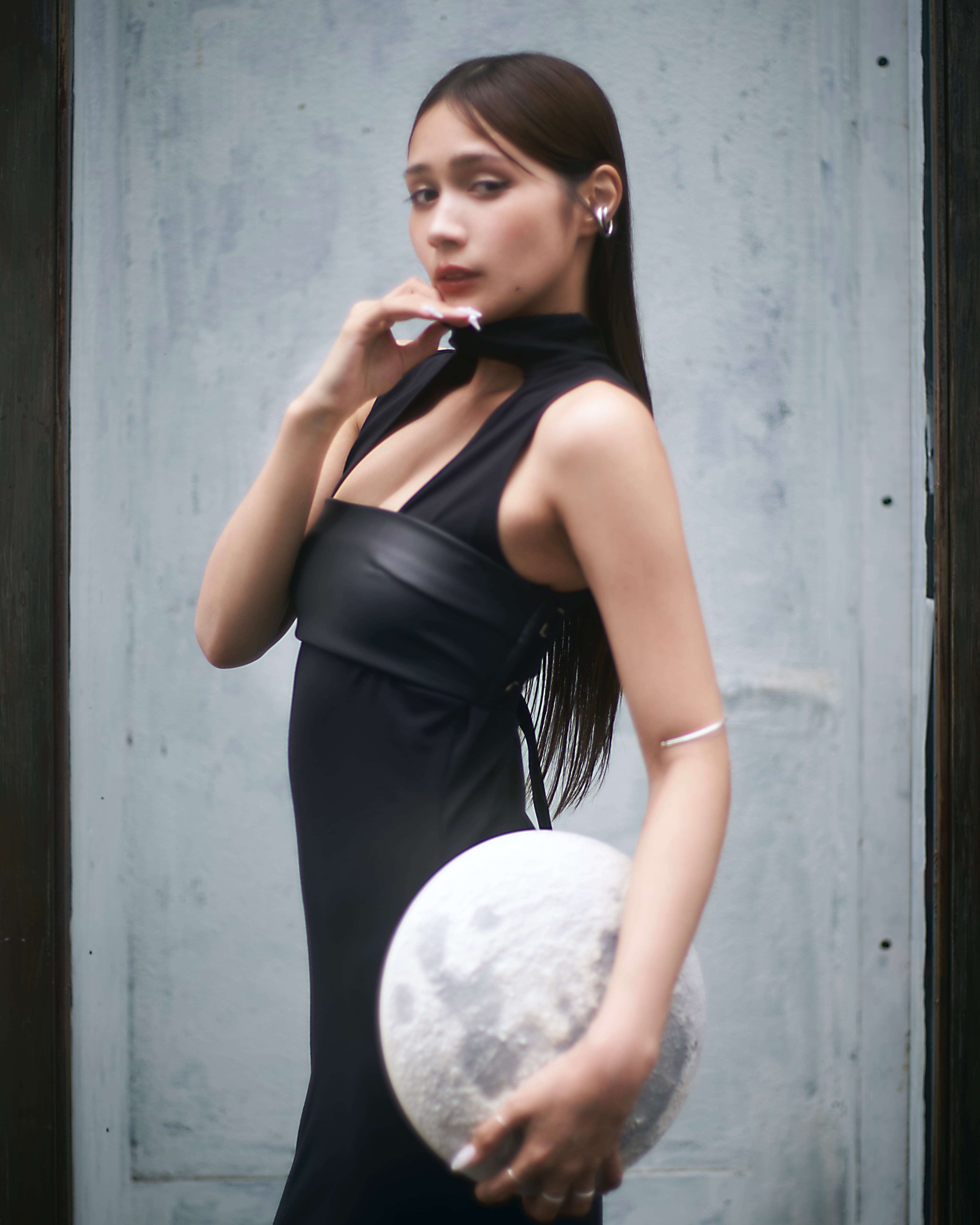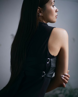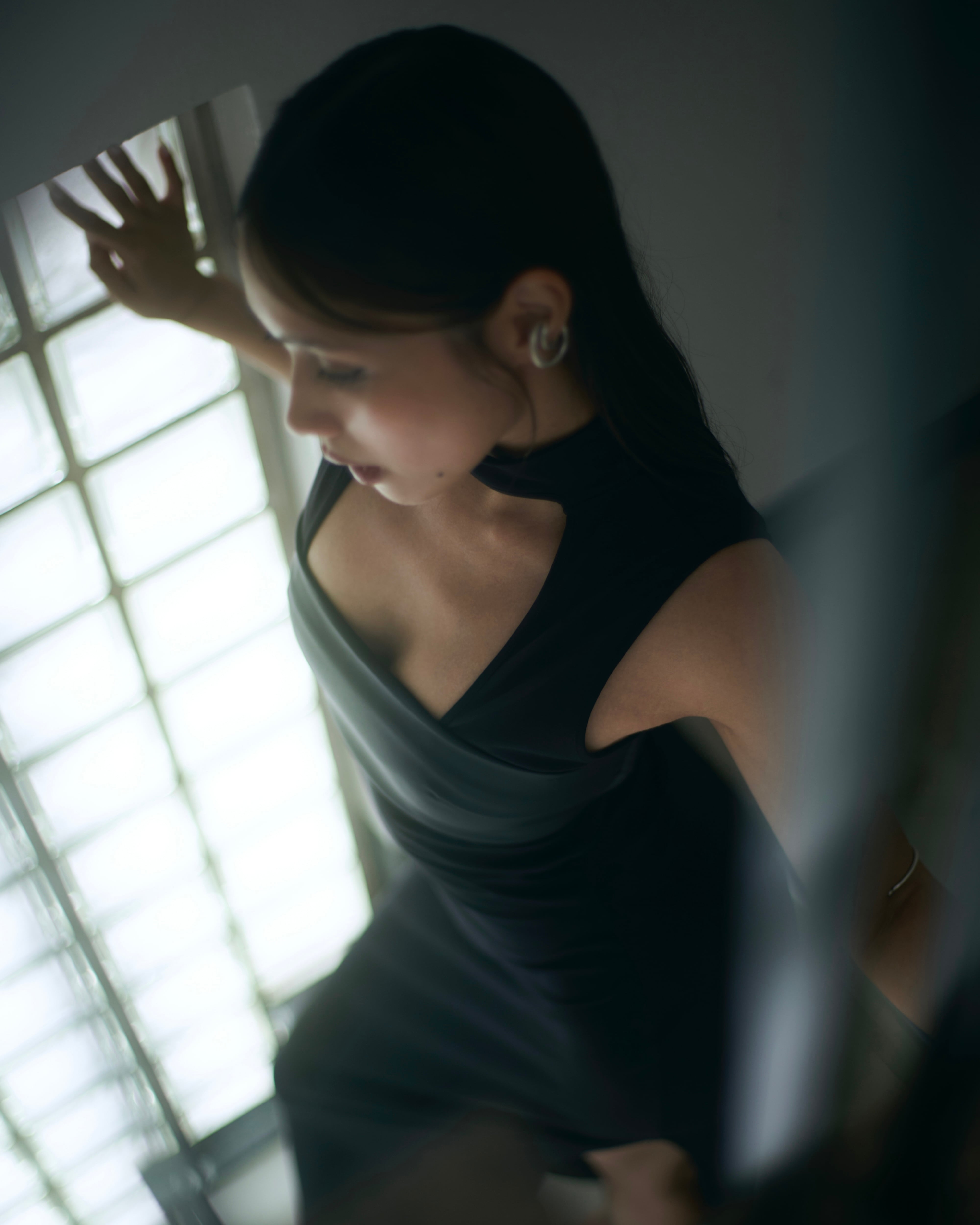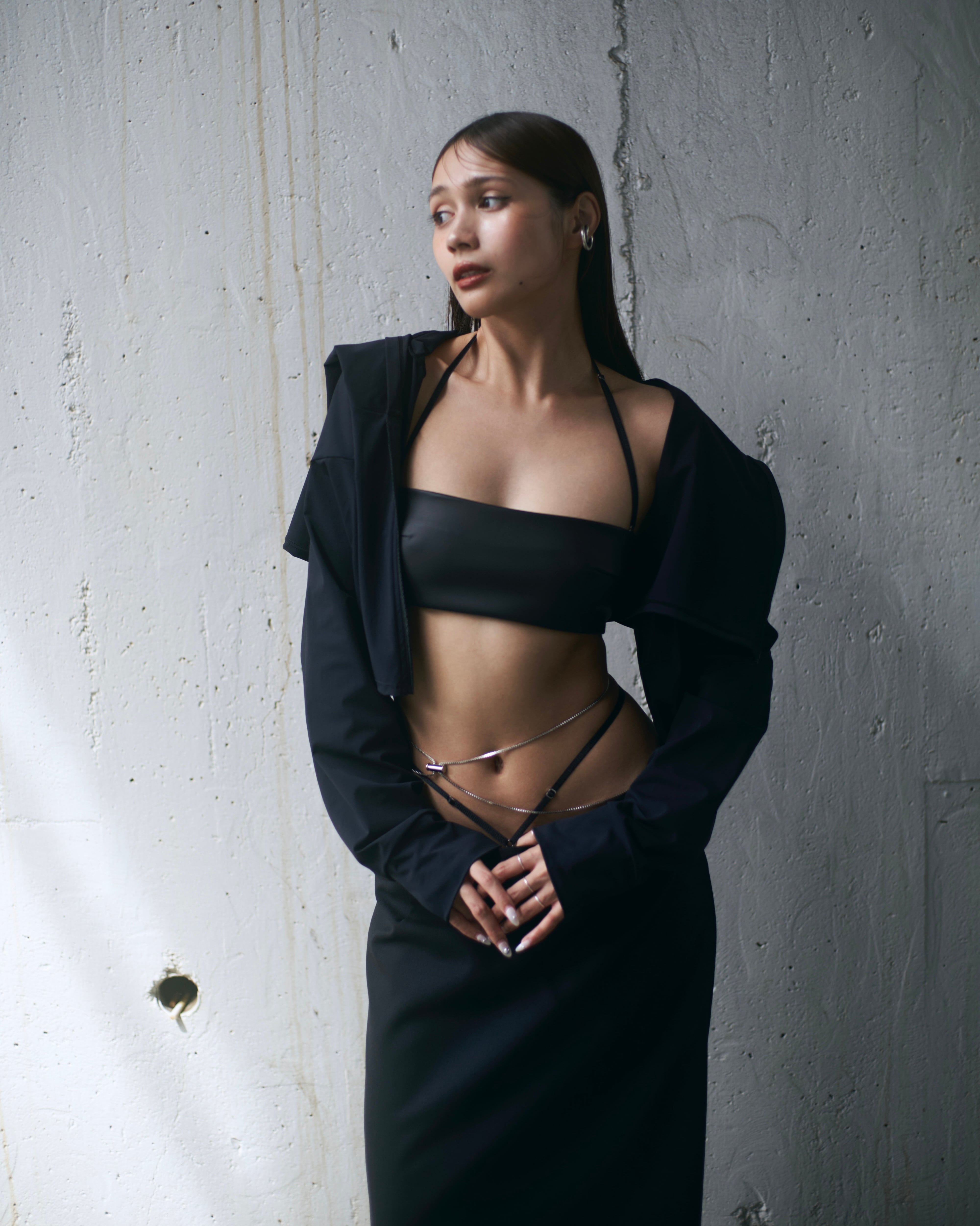 あえて直線的なラインで構成することで、身体の曲線やバストの輪郭がより鮮明に際立つデザインに。