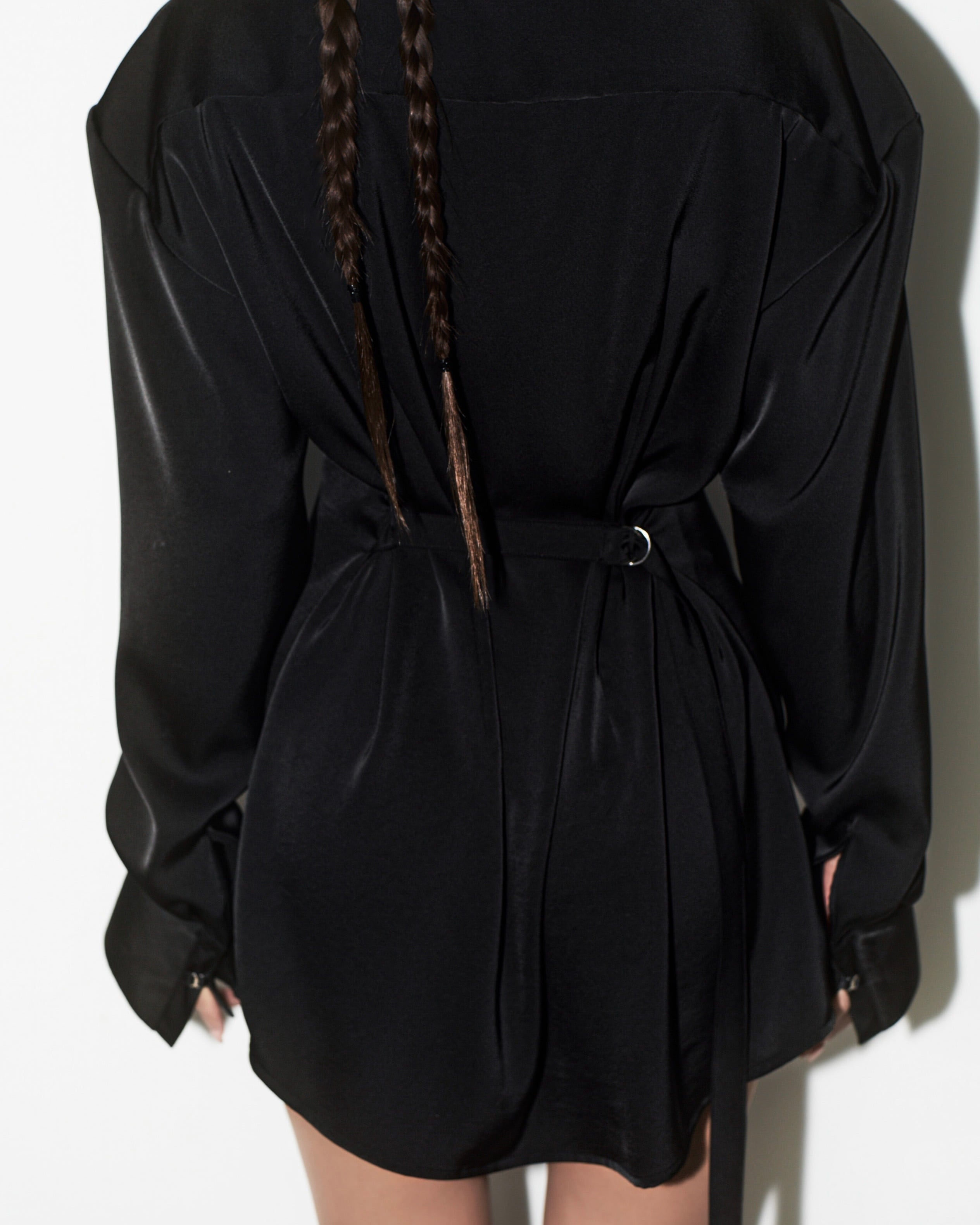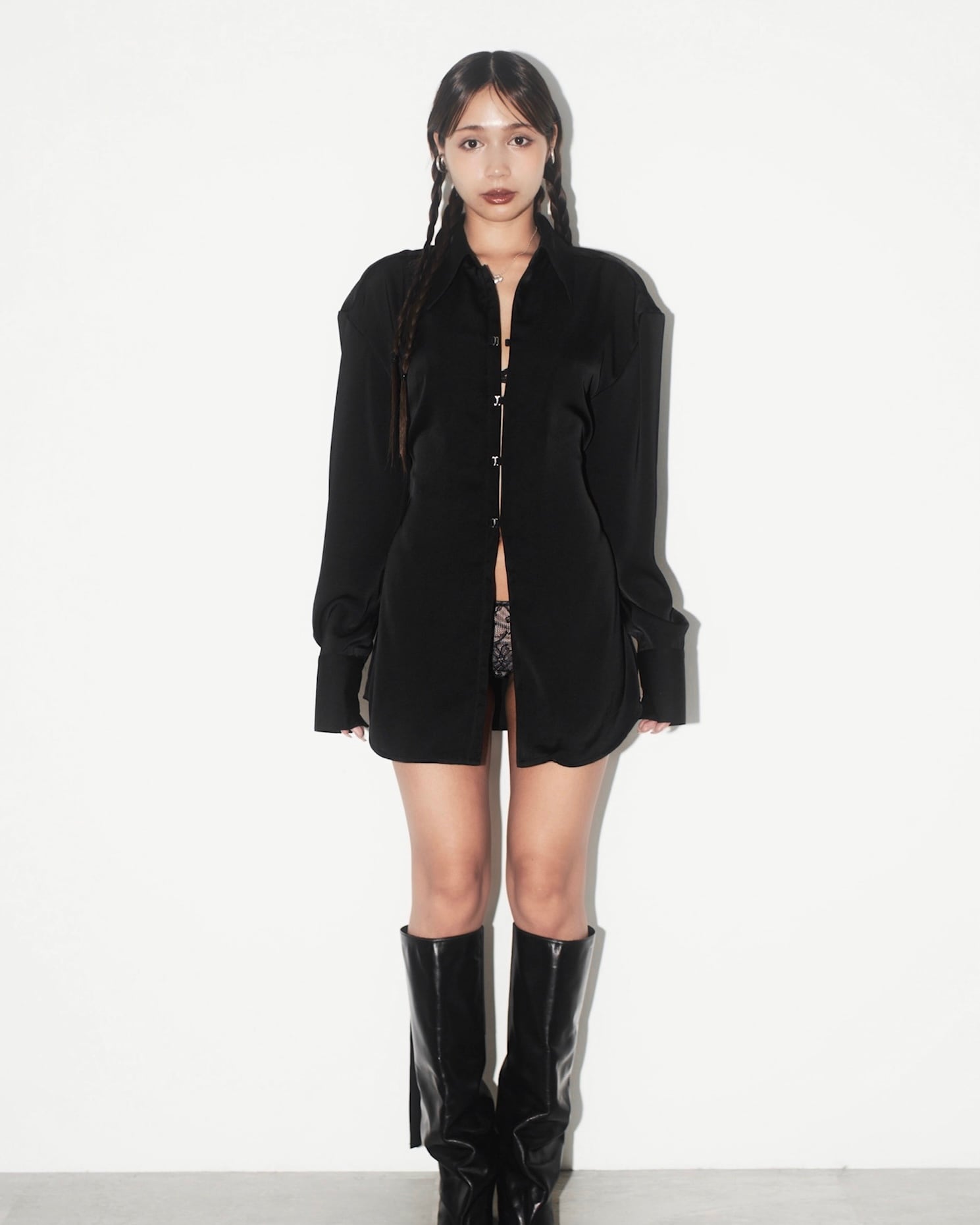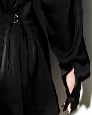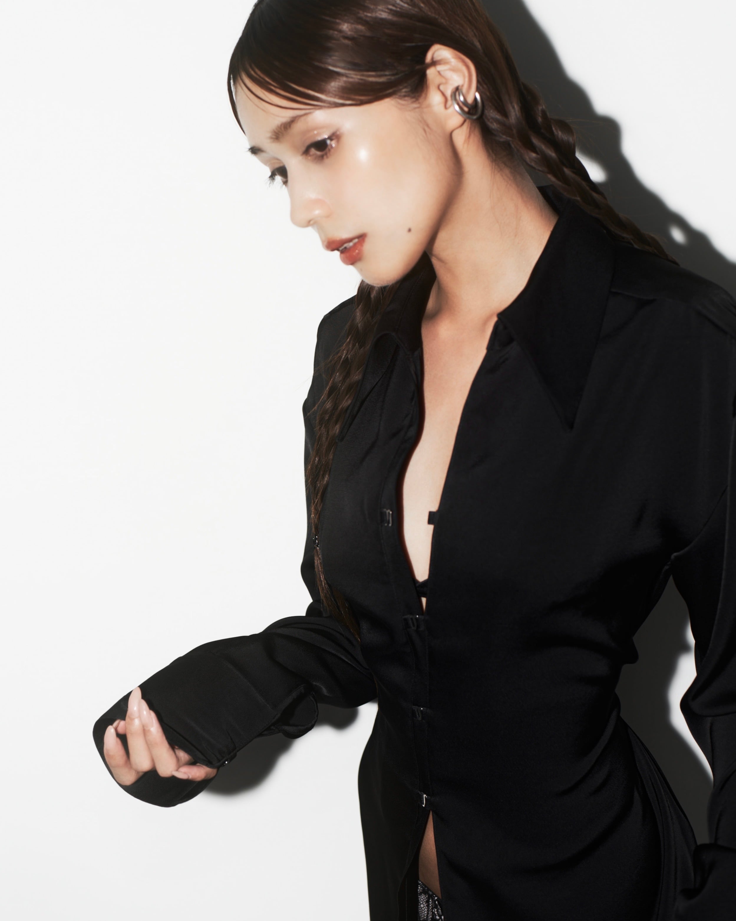 艶やかなサテンの質感が、メンズライクなシャツの構造と重なり合い、