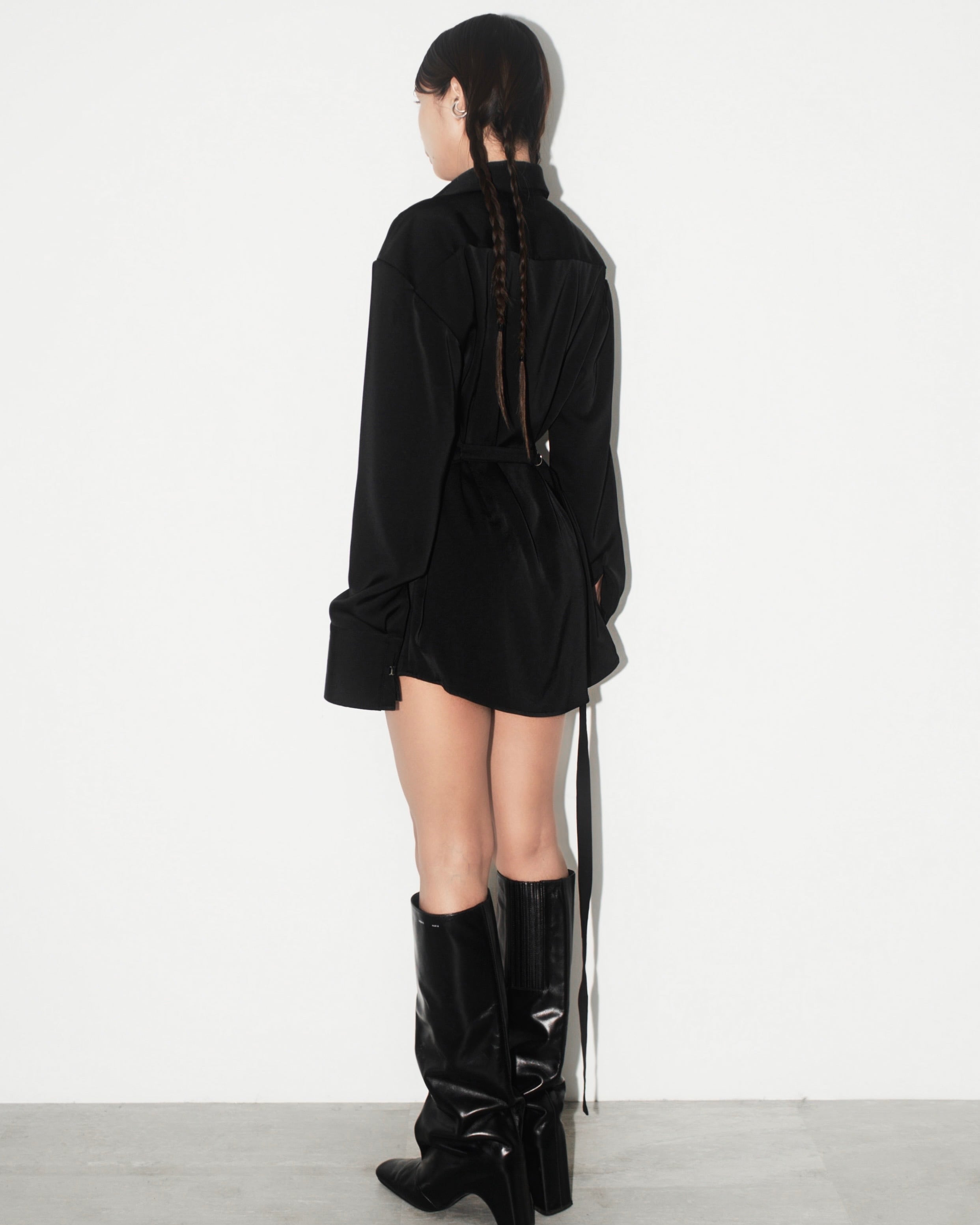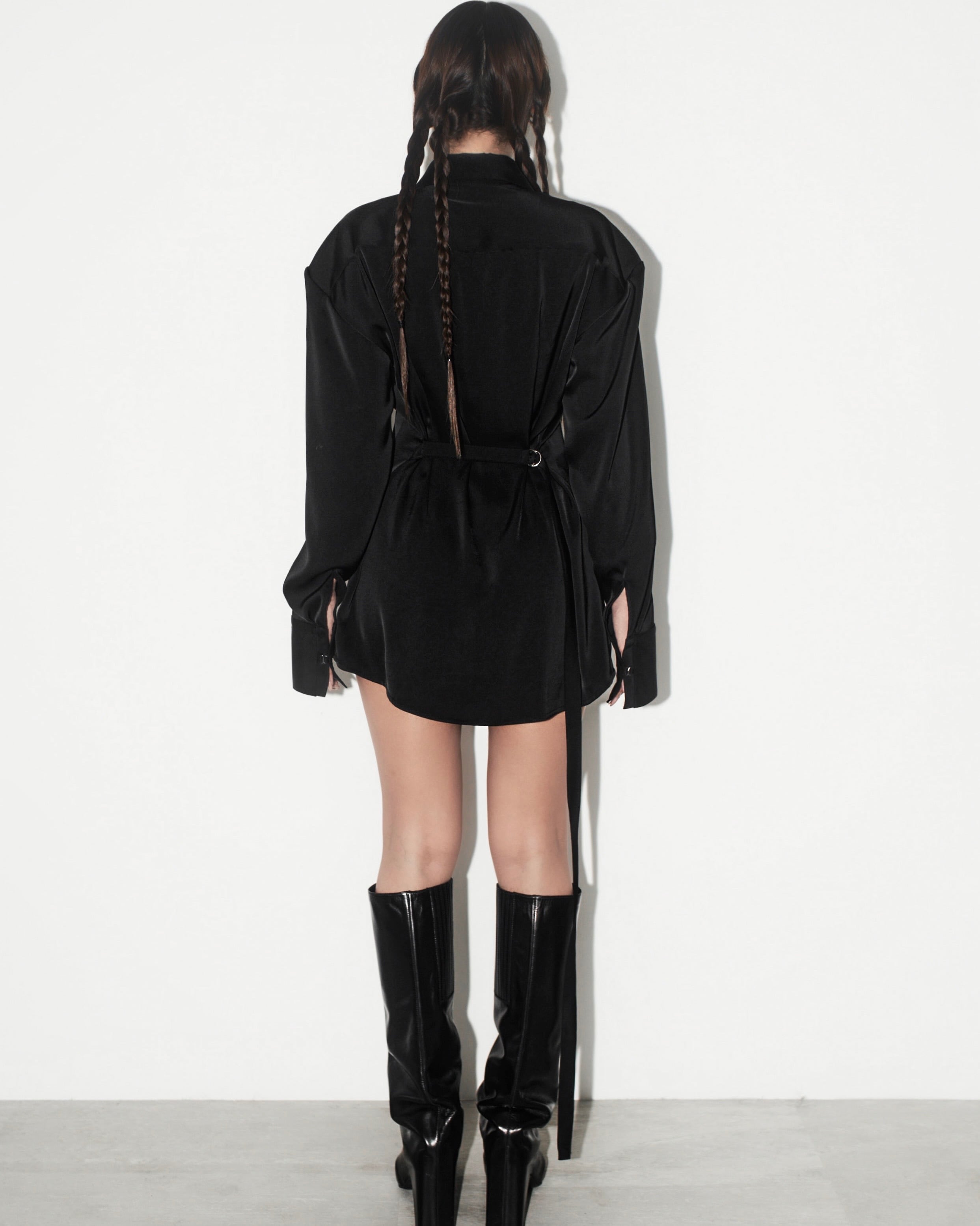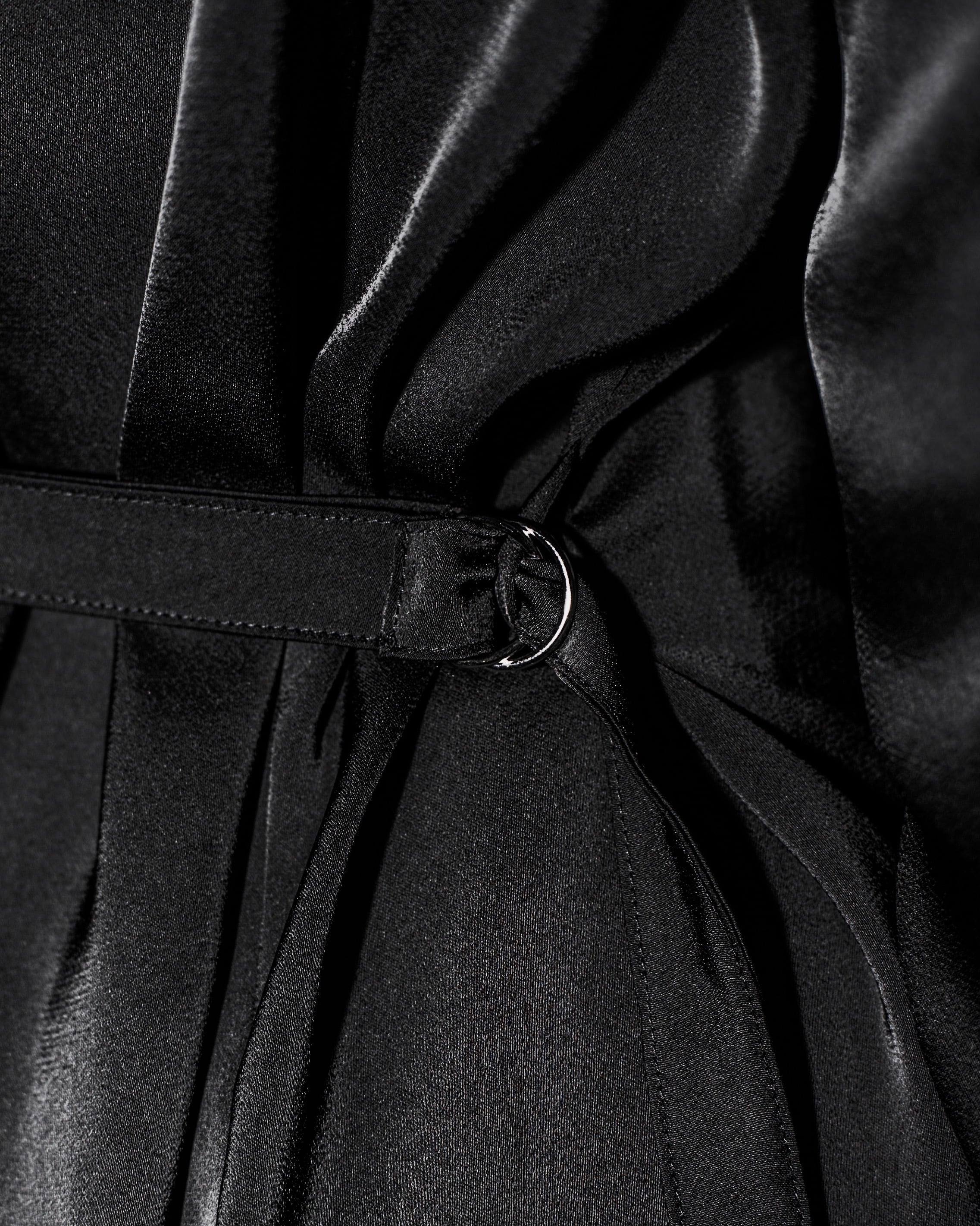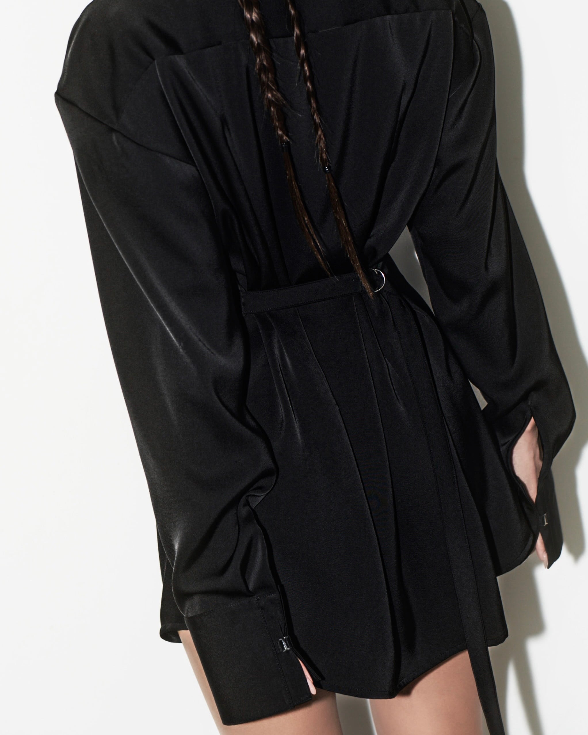 艶やかなサテンの質感が、メンズライクなシャツの構造と重なり合い、