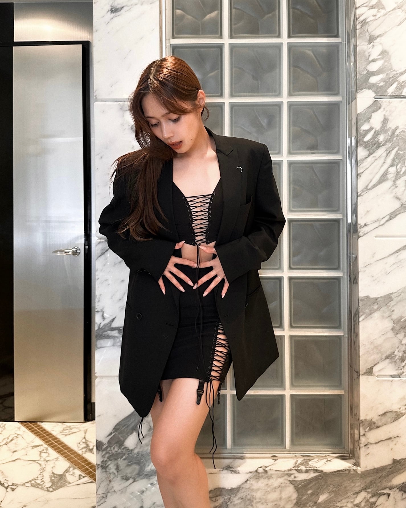 そのトライアングル・ビスチェブラは、構築的でありながら官能的という二面性を備えています。