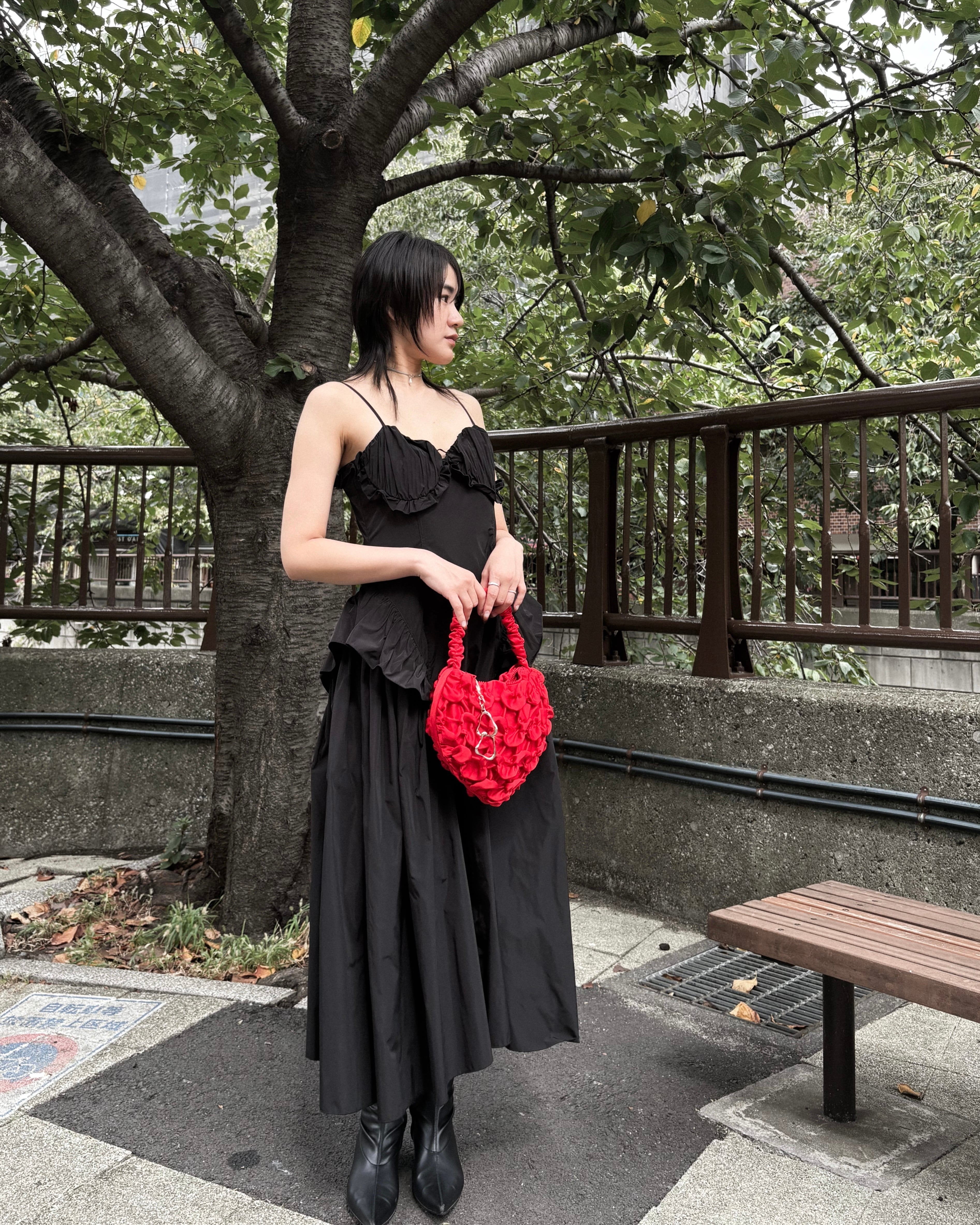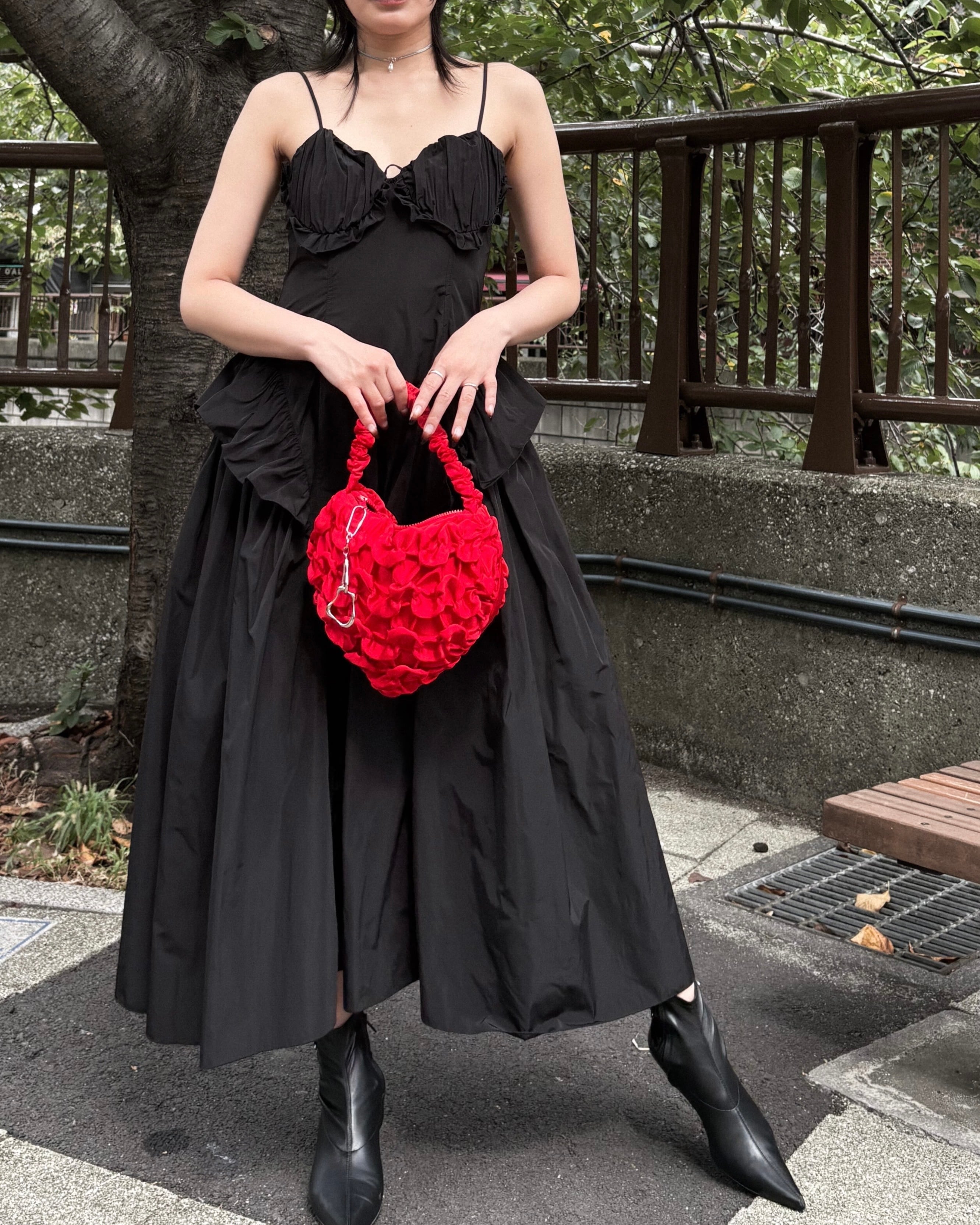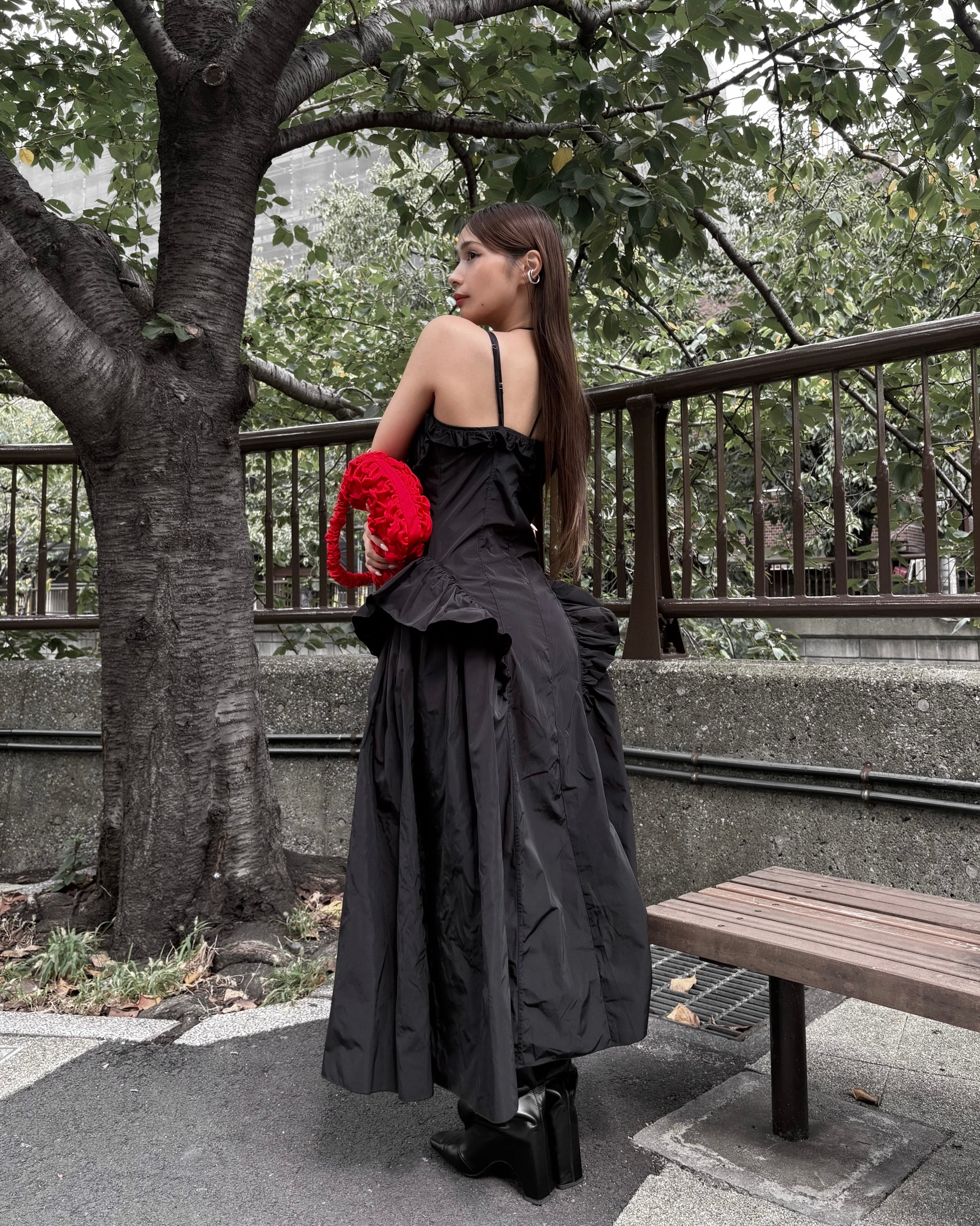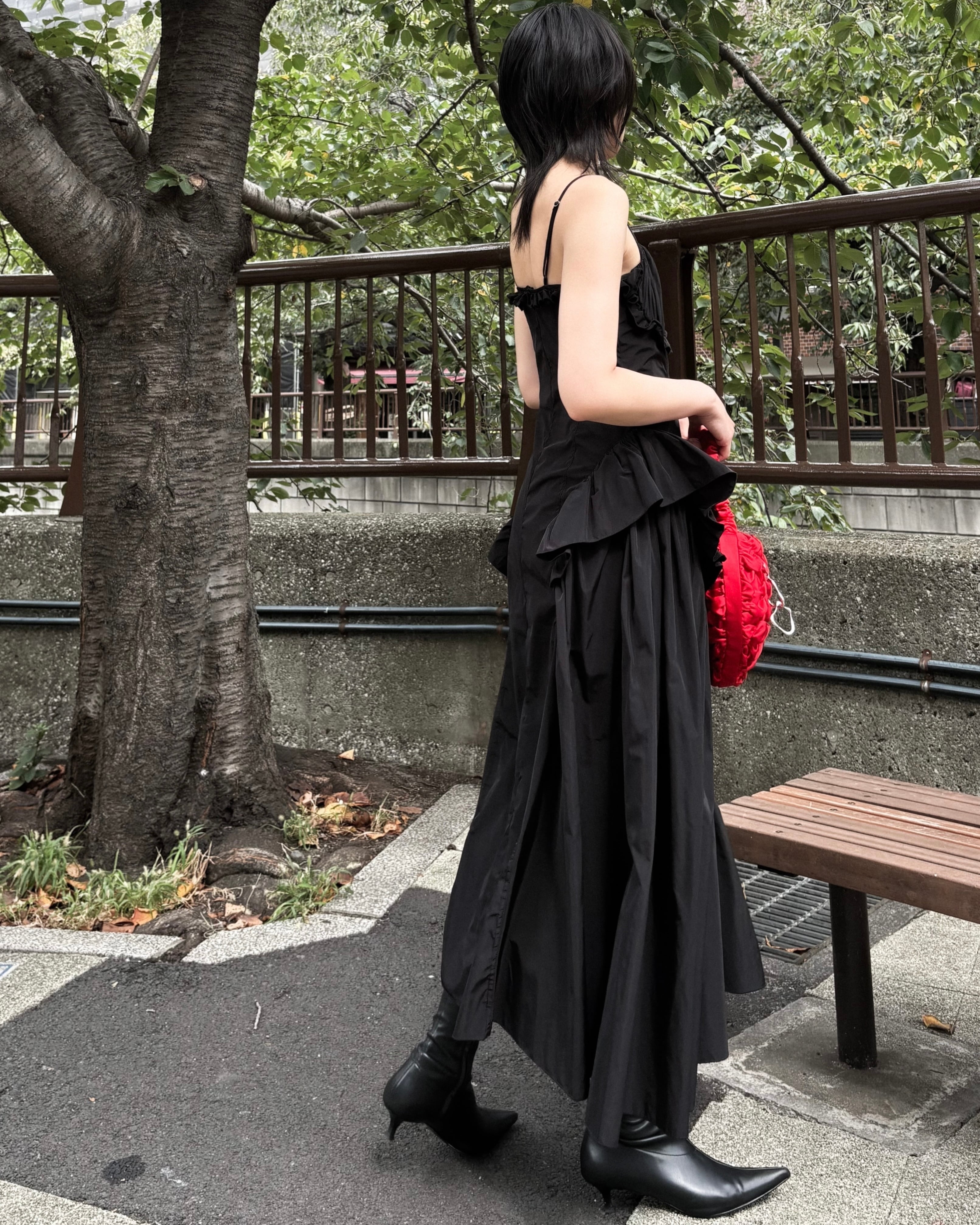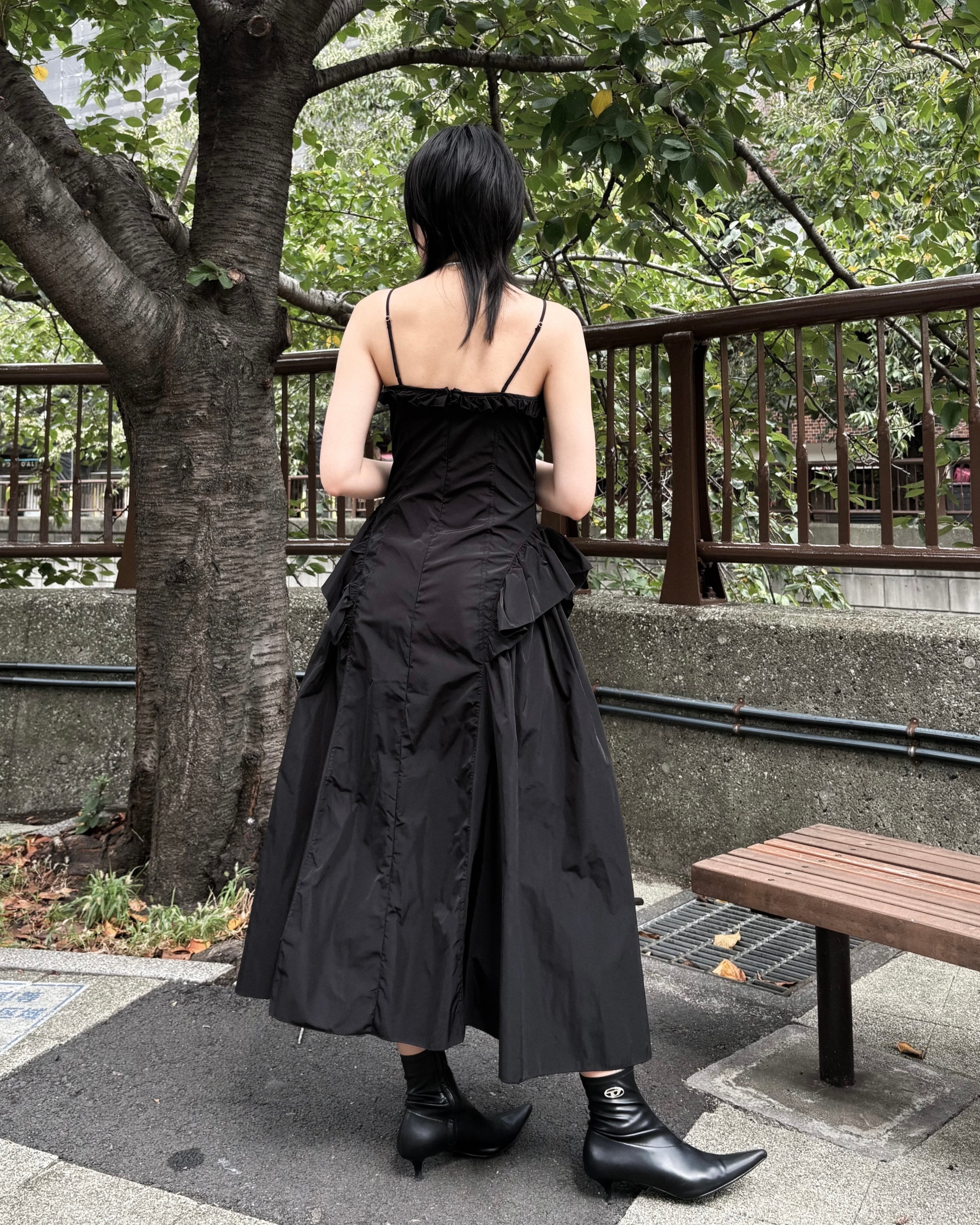 両サイドに寄せた繊細なフリルと、動きに合わせて広がるゴデットパネルが、