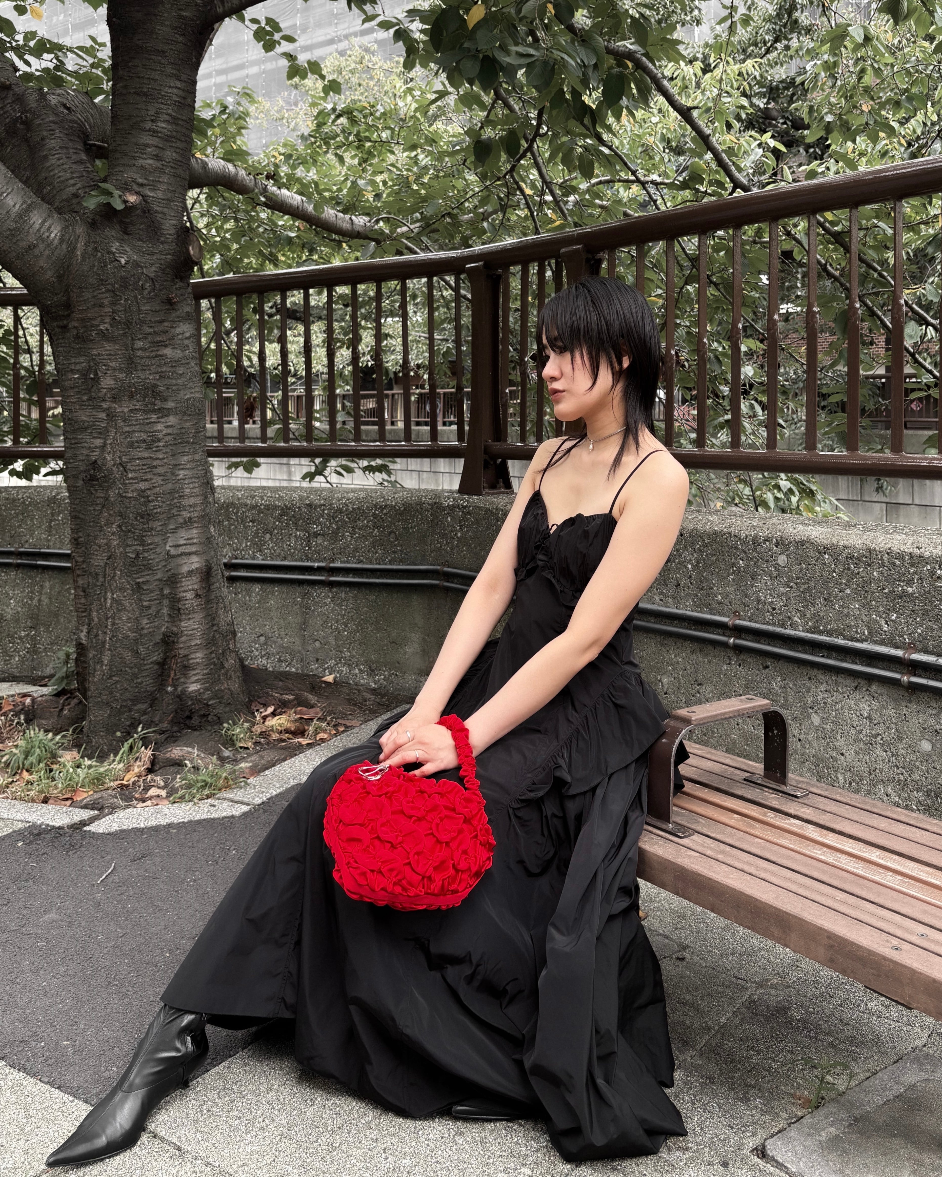 Aラインシルエットとロングミディ丈が、しなやかで女性らしい佇まいを描きます。