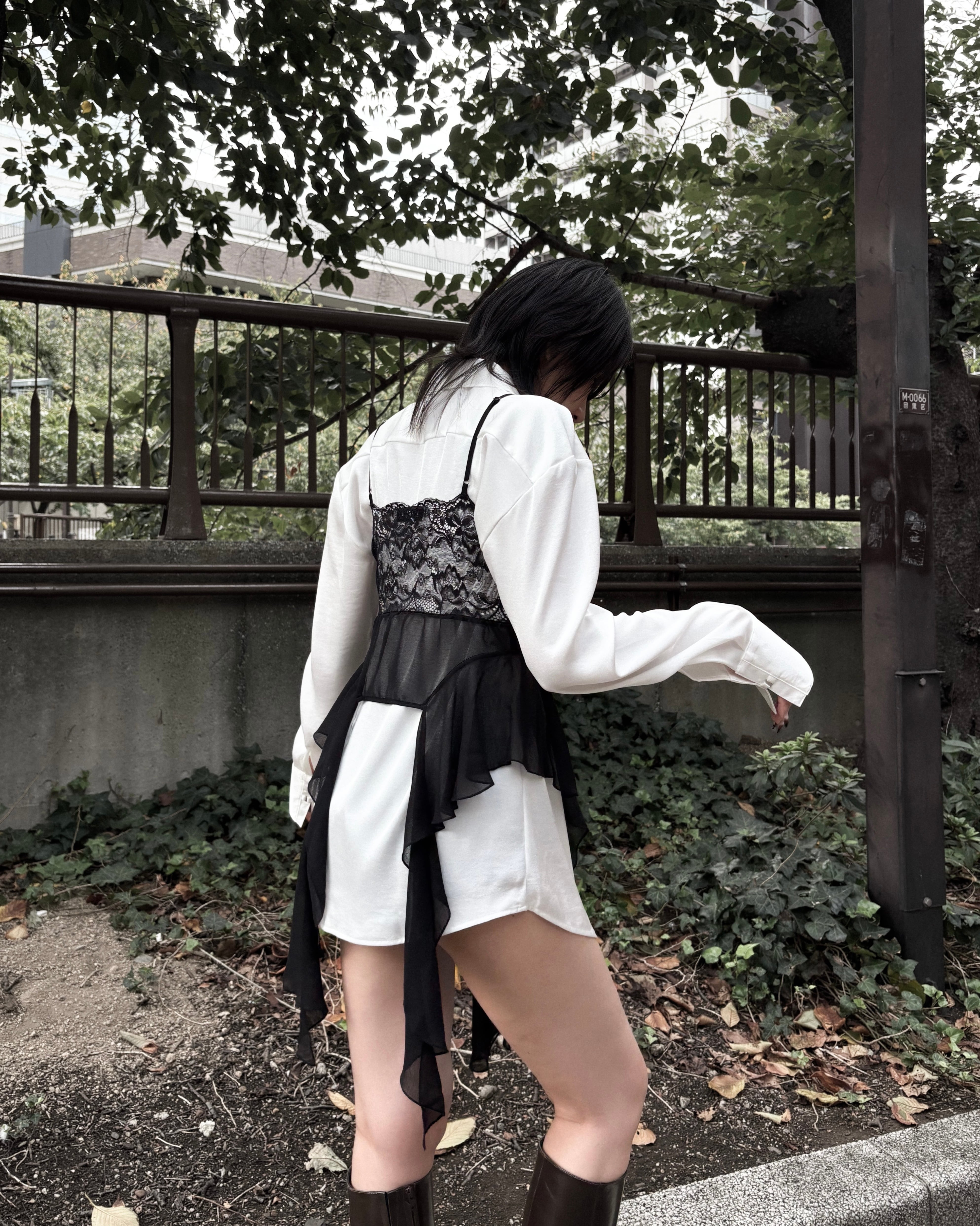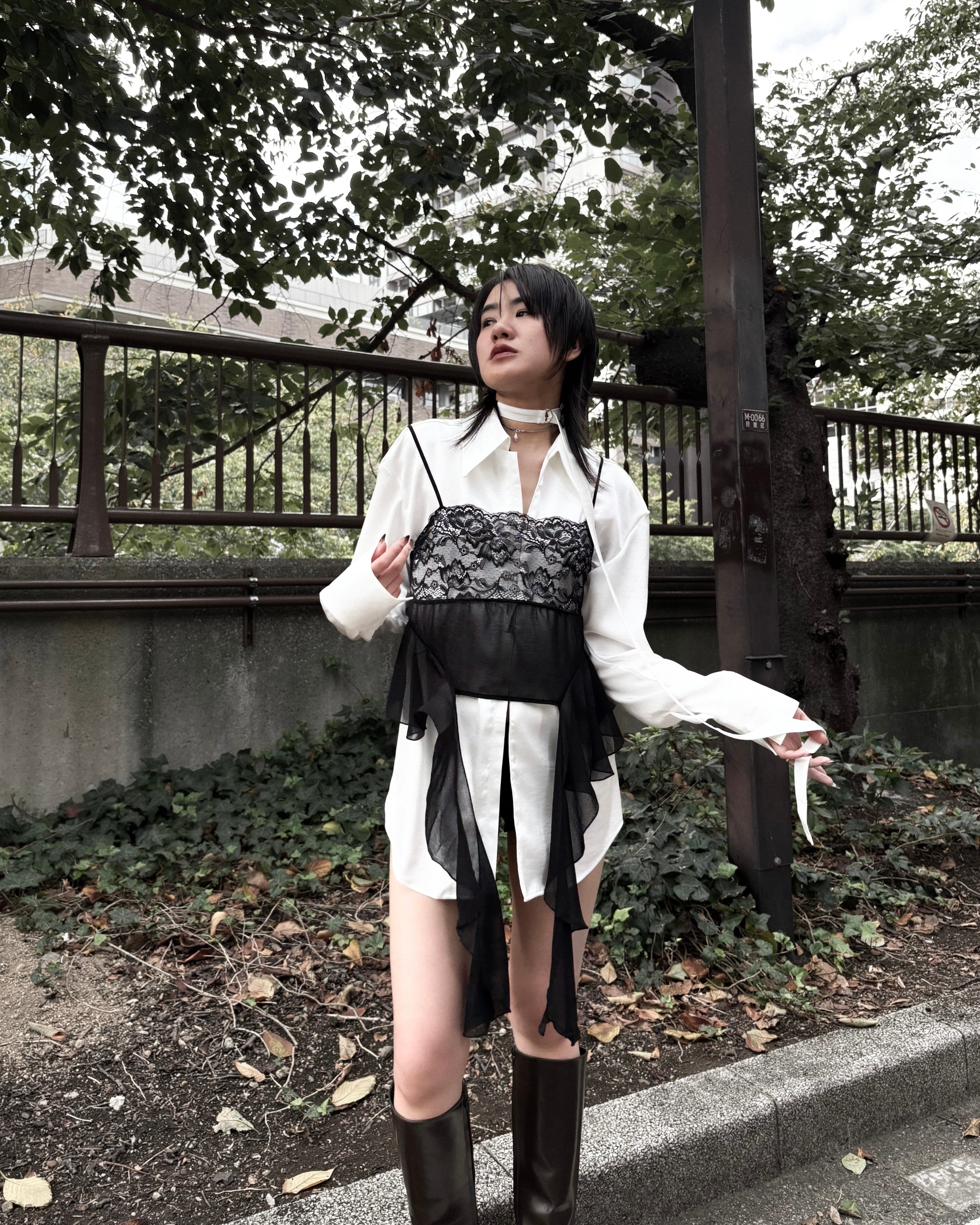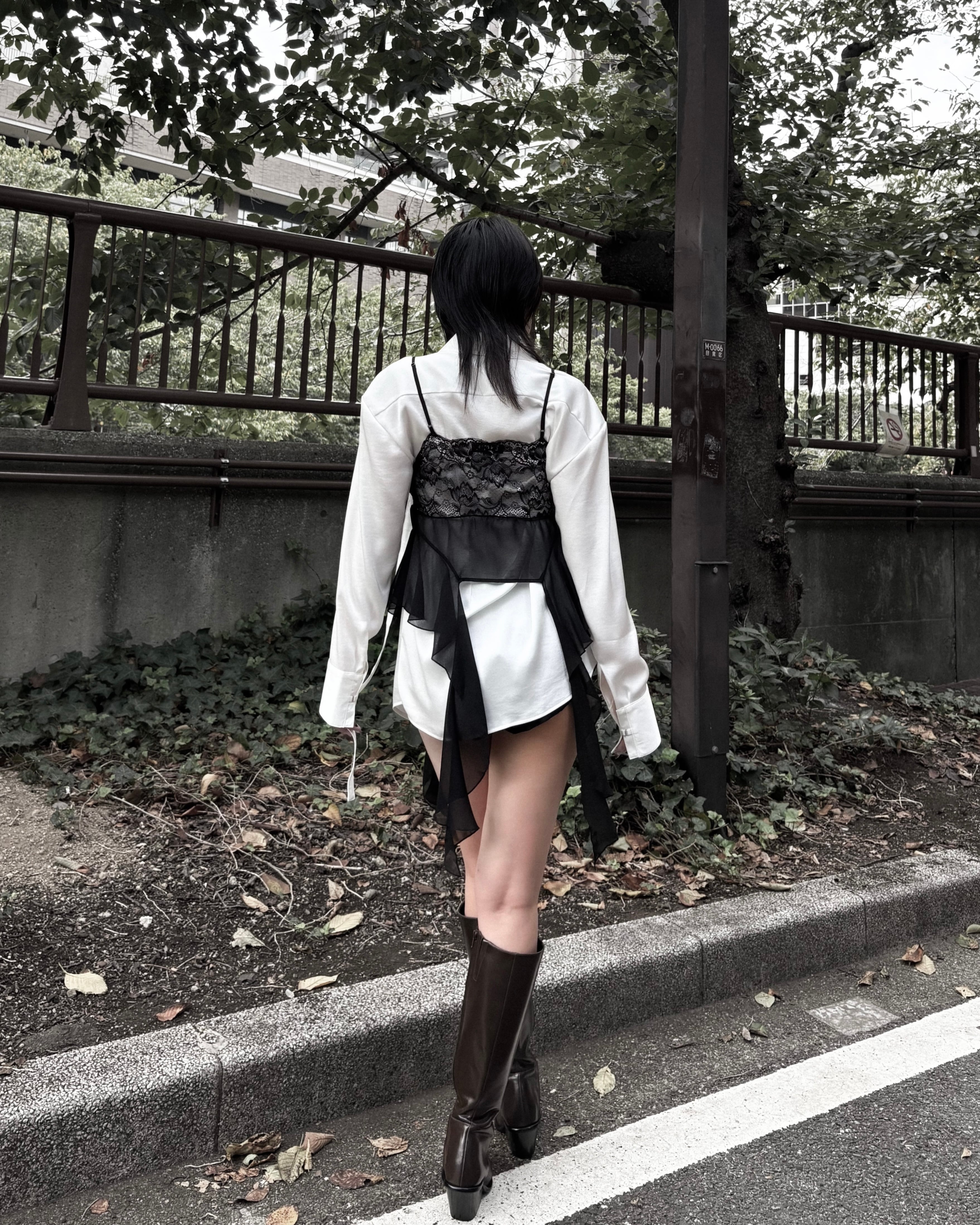 胸元には華奢なレースパネルを配し、さりげないロマンティックさをプラス。