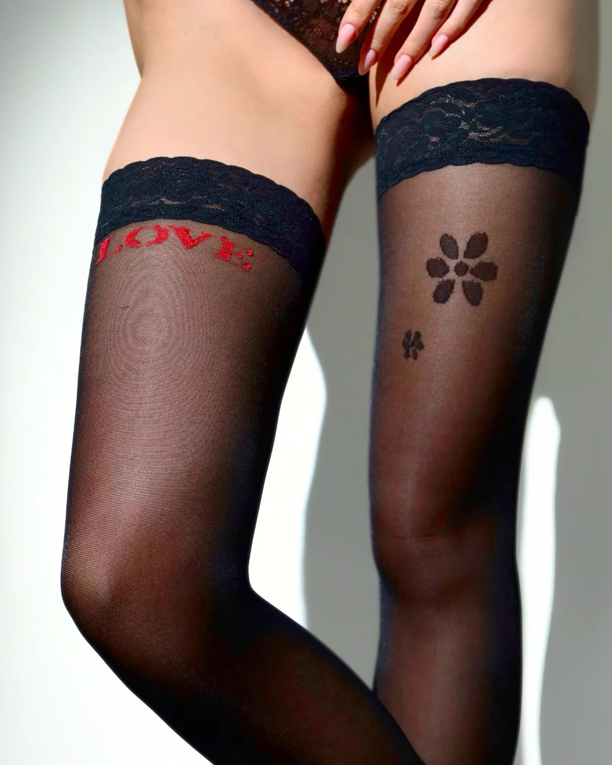 繊細なデイジー刺繍をあしらった、シアーなステイアップストッキング。