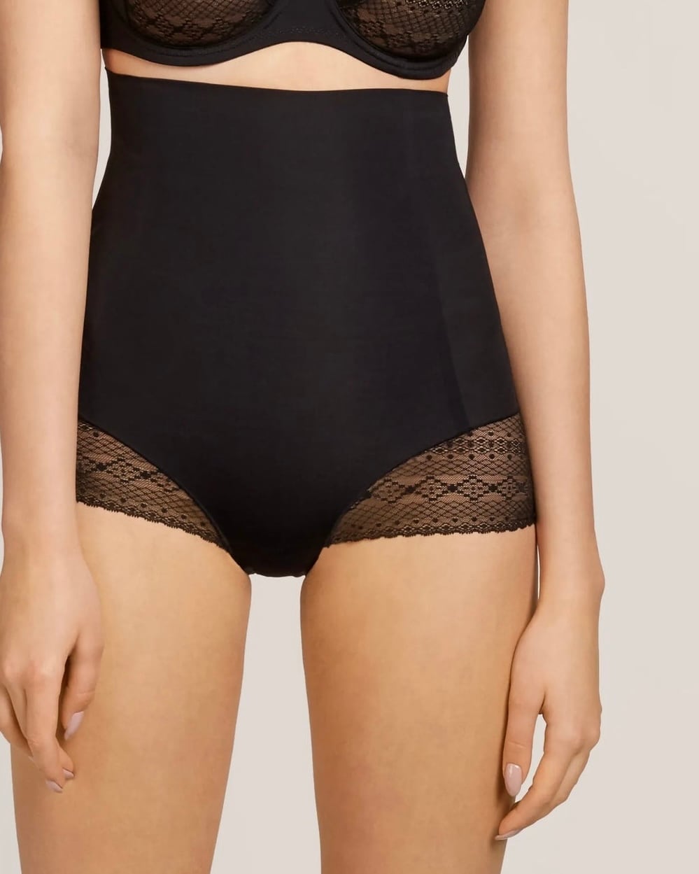 フラットなウエストラインを演出するハイウエスト補整デザイン。