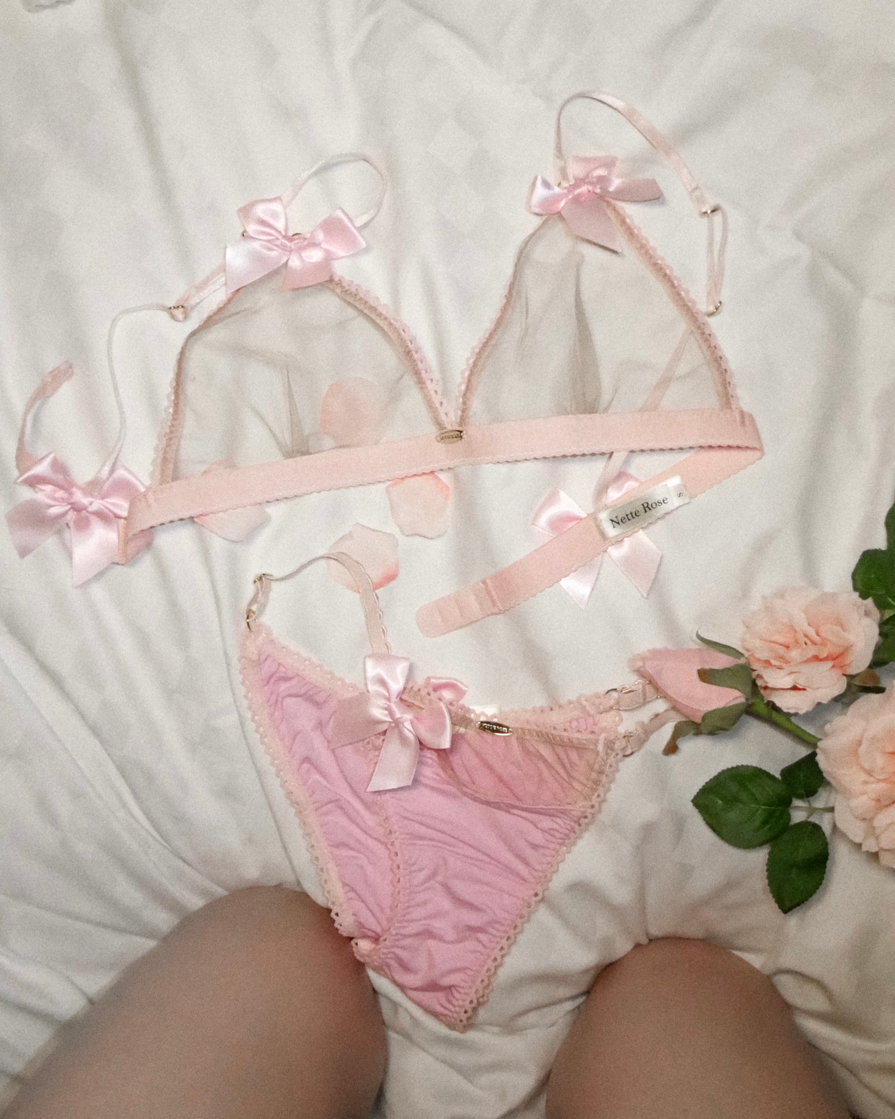 透け感のあるヌードカラーのメッシュに、繊細なトリムとロマンティックなリボン。