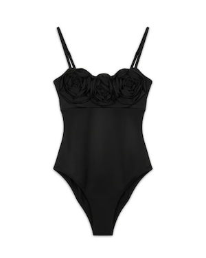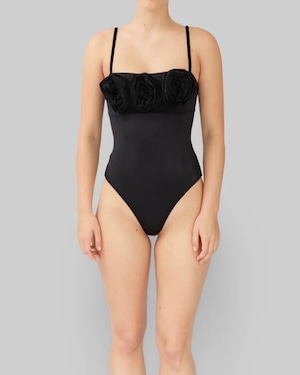 華奢なストラップと、バストにあしらわれた立体的なロゼットが特徴。