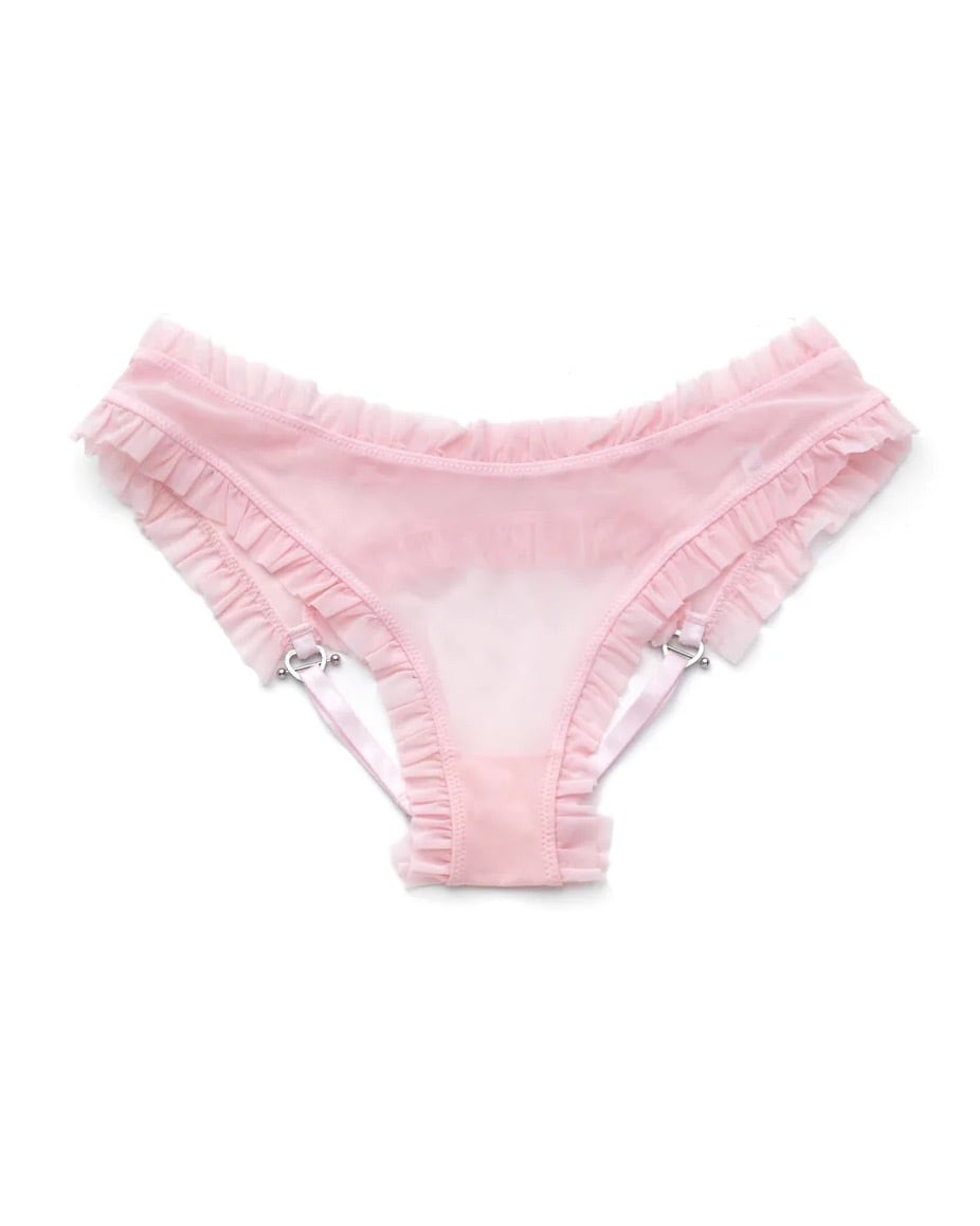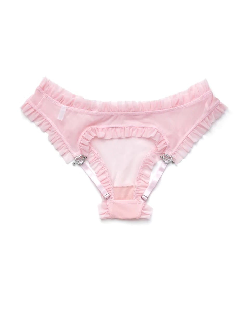 クリスタルのハート型リングがヒップのストラップに施された、キュートなバックレスブリーフ。